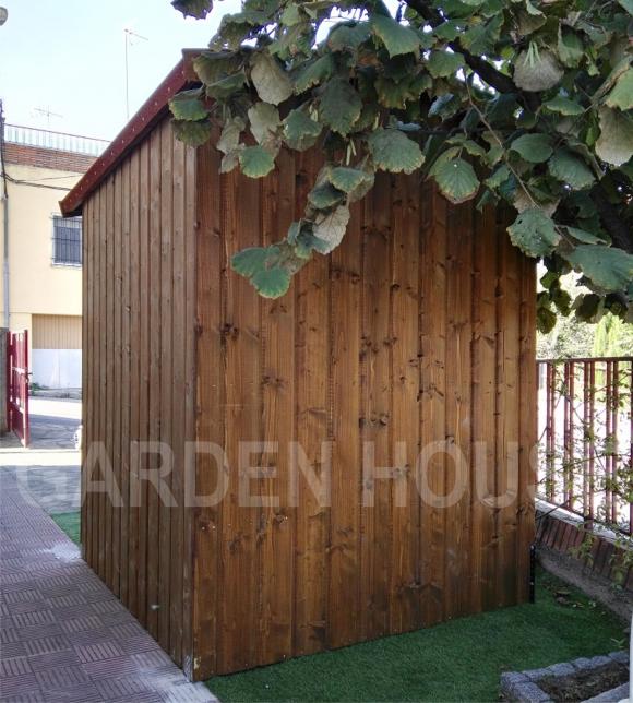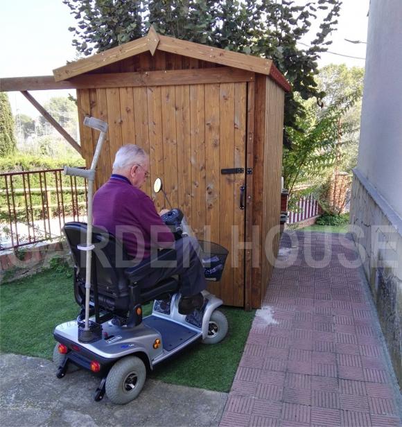Se fabrico un mini garaje con el machihembrado en vertical en color nogal oscuro. Con puerta corredera, tenia que ser cómodo y abrir la puerta sin necesidad de tener que bajar de la Scooter. Para evitar el escalón, se coloco en el suelo una plancha de hierro para que tuviera la entrada directa sin obstáculos.