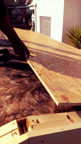 - Planchas de OSB por encima de la lana de roca, superpuestos en los listones. Una vez sujetos a la cubierta, colocamos el Tyvek.