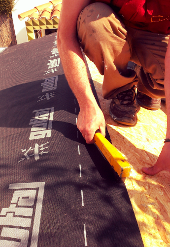 - Tyvek es una material impermeable utilizado para cualquier construcción de vivienda. Ahora si, toda la cubierta tiene el material que hace de doble protección al OSB, colocamos la teja asfáltica.