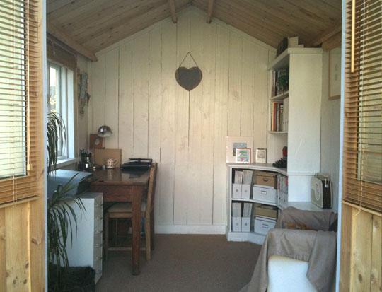 Fijaros también en como han decorado el interior y la distribuición del mobiliario. A pesar de lo pequeño que es el cobertizo lo has sabido aprovechar muy bien. Han colocado un mueble esquinero para aprovechar más espacio y excepto el escritorio el resto de los muebles son en color blanco para dar mayor amplitud. Incluso cabe un pequeño sofá que siempre viene bien en el lugar de trabajo.