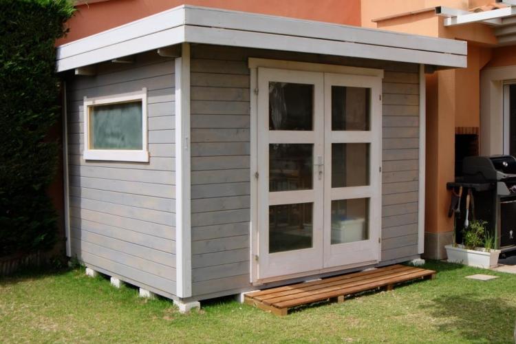 En este caso, la cabaña es el modelo FARO en color gris y blanco.