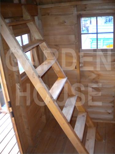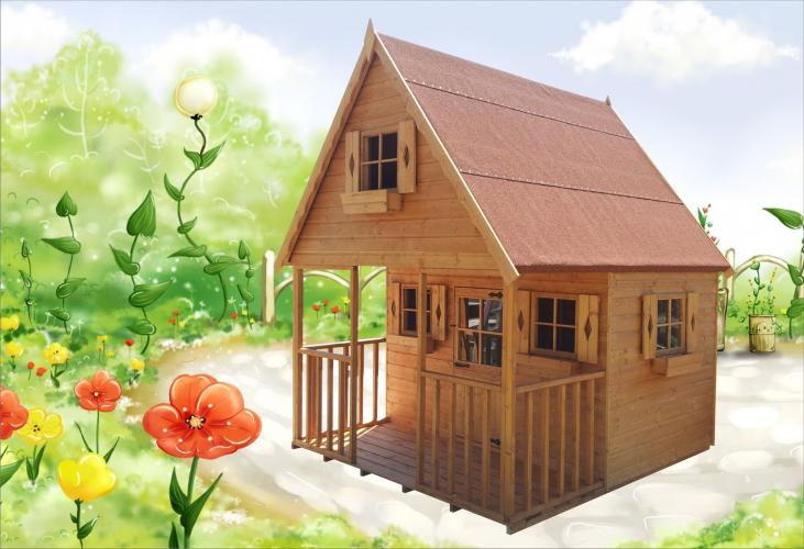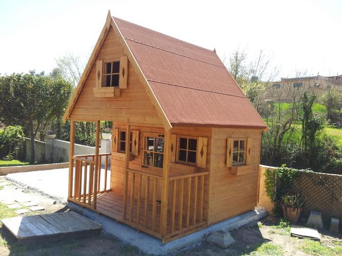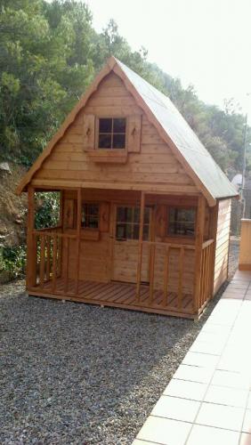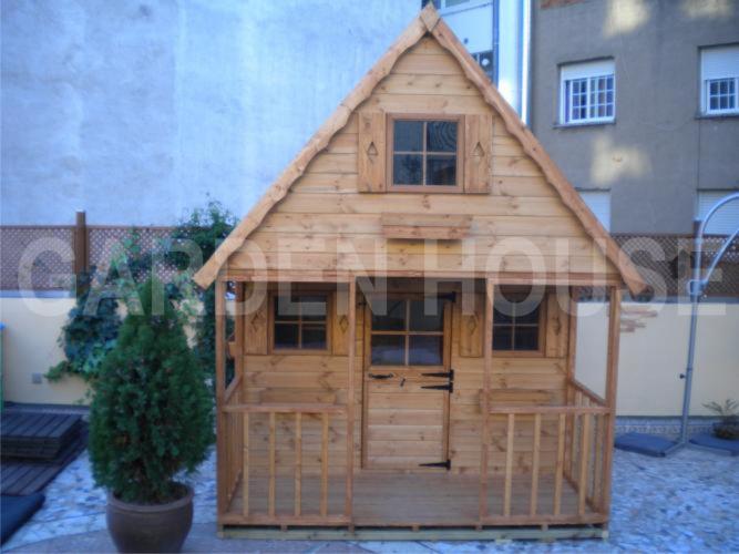 Caseta infantil de madera tratada, con altillo en el interior y terraza en la entrada ideal para crear una ambiente con mesa y sillas y que merienden frente a su casita.