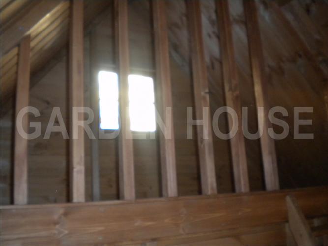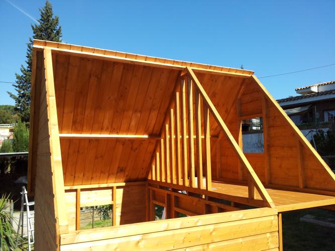 En madera de abeto , tratada, Incluyen las ventanas con jardineras, puerta frontal y el suelo. La cubierta es de madera con tela asfáltica. Las ventanas no llevan cristal, es metacrilato.