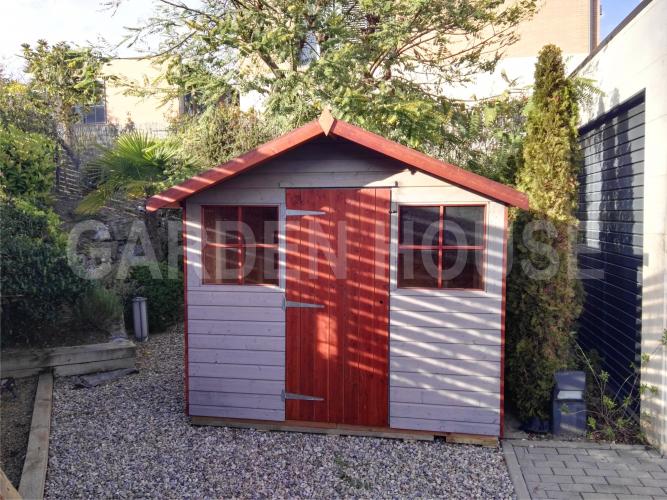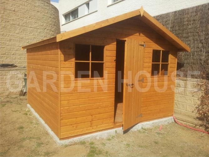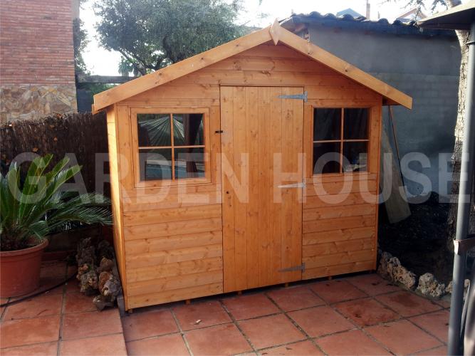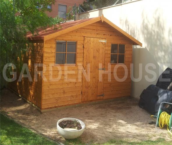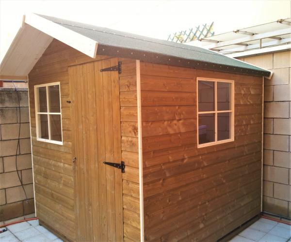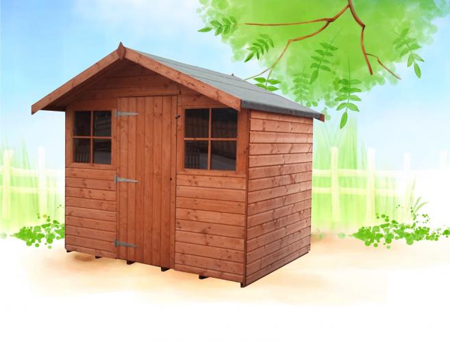 El cobertizo Warwick Conversión de madera tratada en color almendra con cubierta a dos aguas. El grosor puede ser de 15 o 20 mm. La altura en la parte alta es de 2250 o 2300 mm dependiendo del tamaño. Madera tratada en color estándar almendra o el color que elija de nuestra extensa gama de colores.