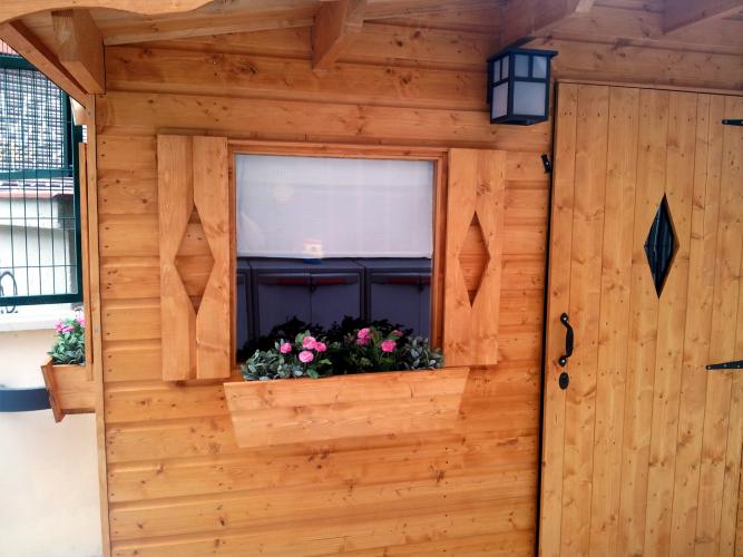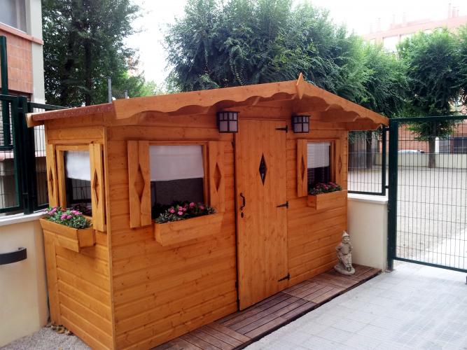 El espacio es en forma de triangulo, el lateral derecho de 1.50 m. y el lateral izquierdo de 4.10 m. incluyendo el voladizo de la cubierta, por lo que una caseta con medidas estándar no era posible. Se adapto el modelo Robin, y la hicimos a medida, con una grosor de 15 mm en madera tratada en color, aprovechando al máximo el espacio. Con jardineras y contraventanas decorativas. Después con la decoración le dieron un aspecto de cuento de fantasía, y colorín colorado este cuento se ha acabado...