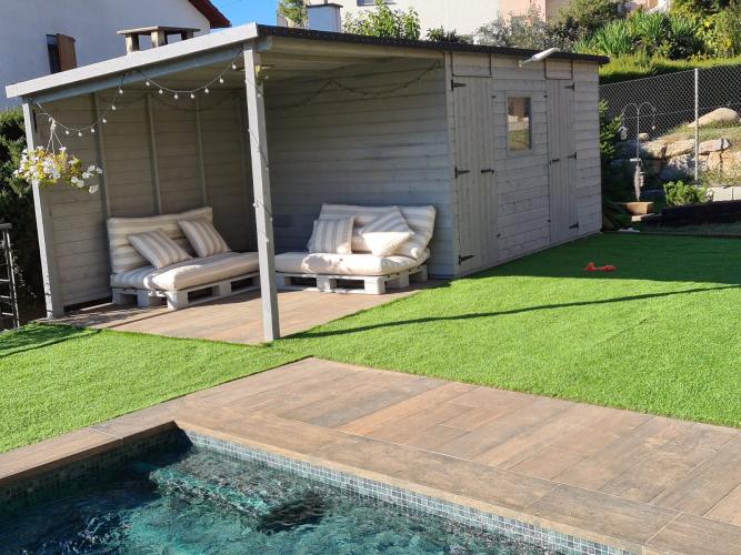En este proyecto el cliente necesitaba un cobertizo para guardar todos los enseres de la piscina, y a la vez crear un ambiente Chill-out para disfrutar de la bonita zona de relax con sofás al lado de la piscina. Se decidió por un cobertizo Kent con un porche adosado, para tenerlo todo recogido y disfrutar del exterior al lado de la piscina. El color del tratamiento es color Gris.