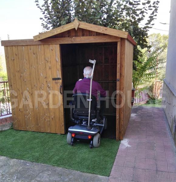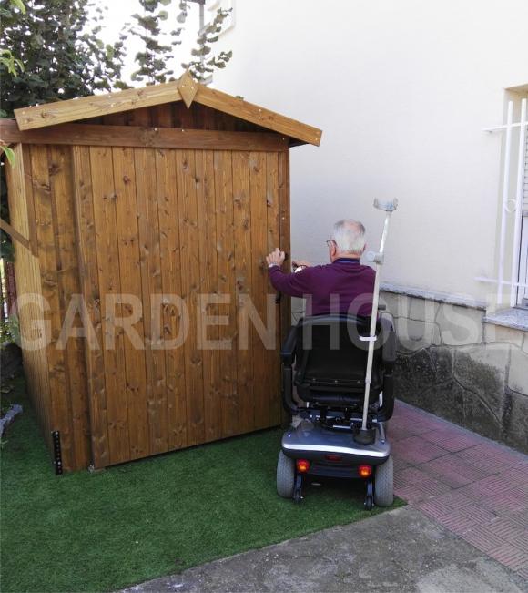 Se fabrico un mini garaje con el machihembrado en vertical en color nogal oscuro. Con puerta corredera, tenia que ser cómodo y abrir la puerta sin necesidad de tener que bajar de la Scooter. Para evitar el escalón, se coloco en el suelo una plancha de hierro para que tuviera la entrada directa sin obstáculos.