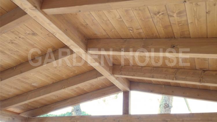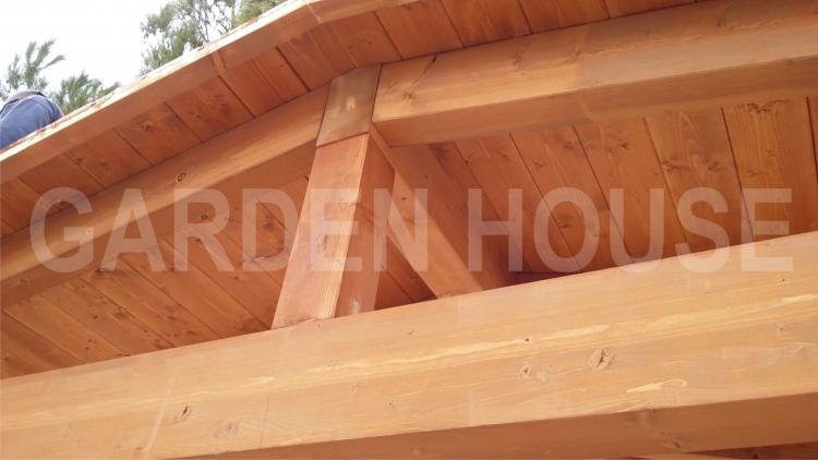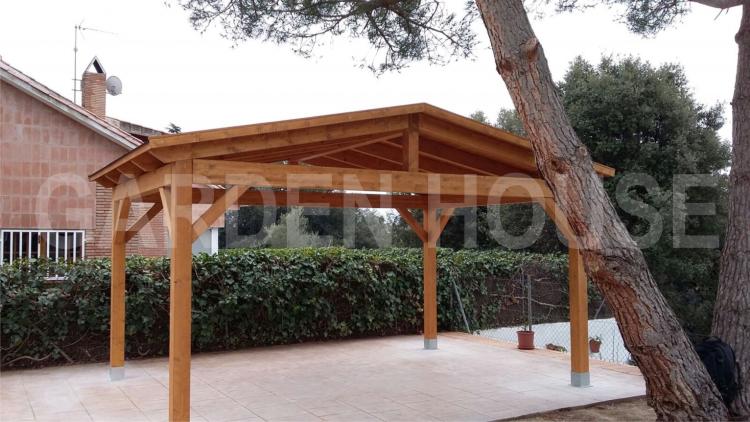 Porche con cubierta a dos aguas. Cada cliente es diferente, por el espacio del que dispone y su gusto. A uno de nuestros clientes le gusto el porche con cubierta a dos aguas y tenia el espacio idóneo para ello. Con un entorno lleno de vegetación mediterránea.